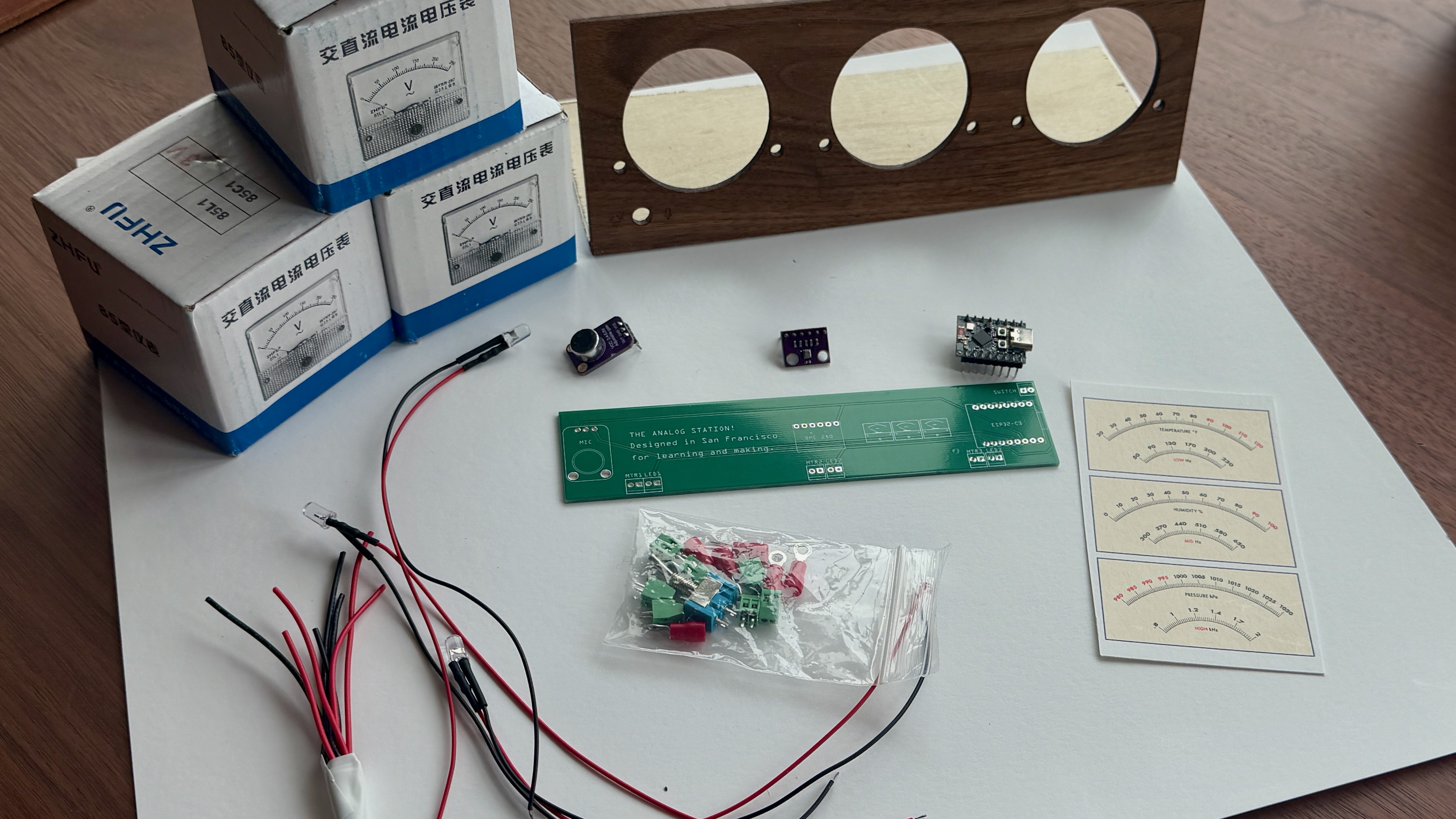 A hands-on workshop in a kit, The Analog Station merges the tactile vibe of analog meters with modern sensor technologies, web connectivity and creative code. All with a warm analog glow!